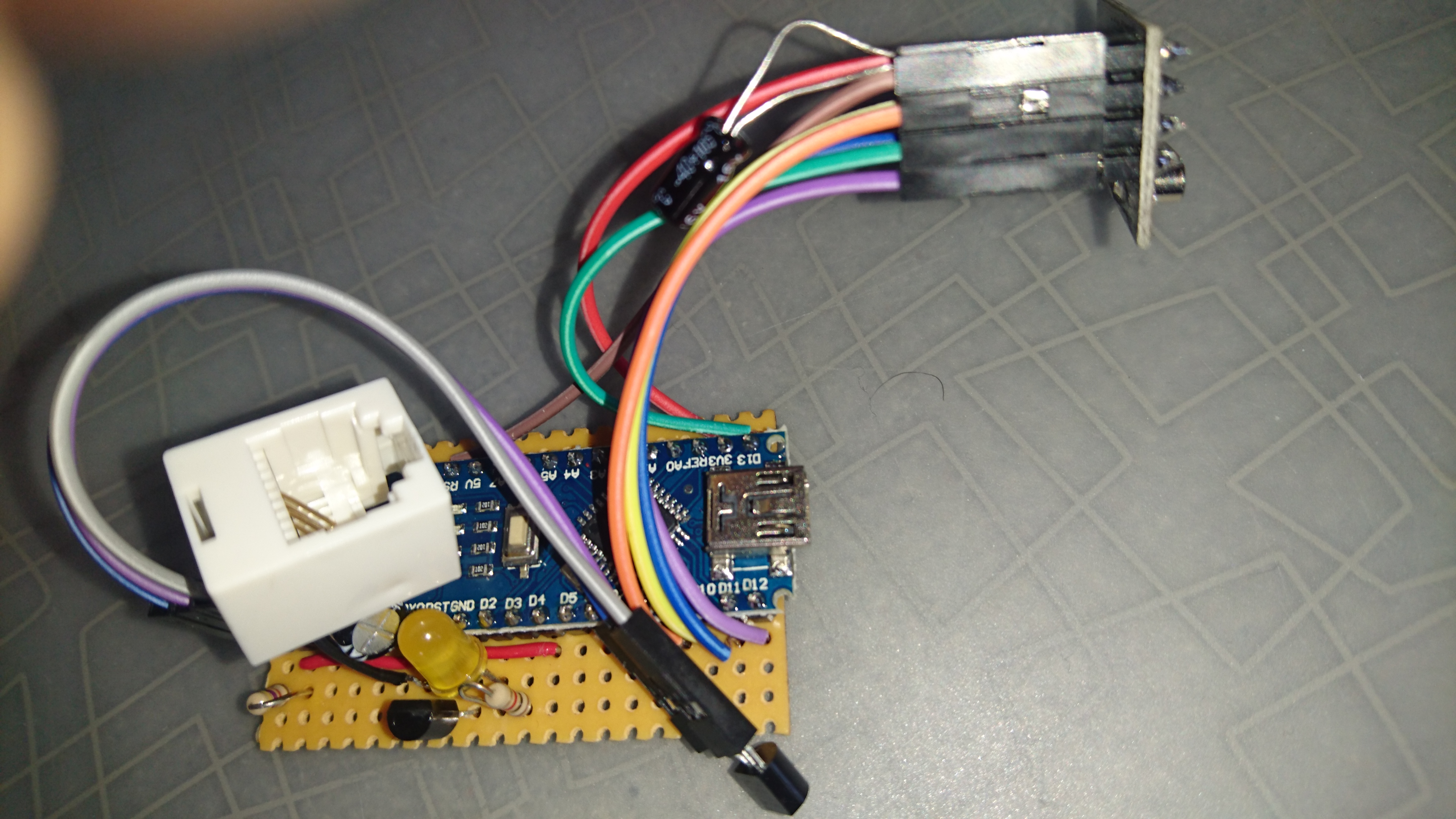 The sensor node measures the room temperature with a DS18B20 also connected through a 4 lead cable. Optionally you can attach a mini PIR motion sensor to this cable so the node can detect presence in the room. The 4 pins are +5V, GND, PIR, TEMP. TEMP is connected to D4 on the Arduino, PIR is connected to D5. The PIR pin could equally well be connected to a reed switch to operate as door alarm.