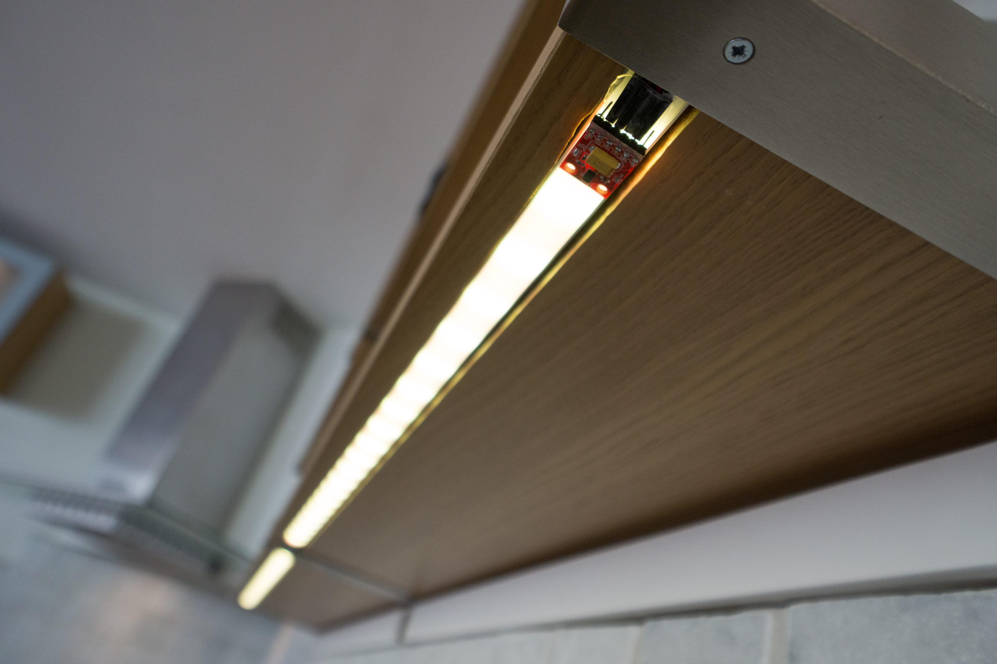 Dimmable LED kitchen light using Arduino, the APDS-9960 gesture sensor and a 12V RGBWW led strip.