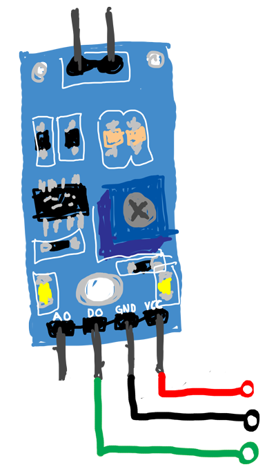 | DO (digital out) | Digital pin 3 (D3) | Green |