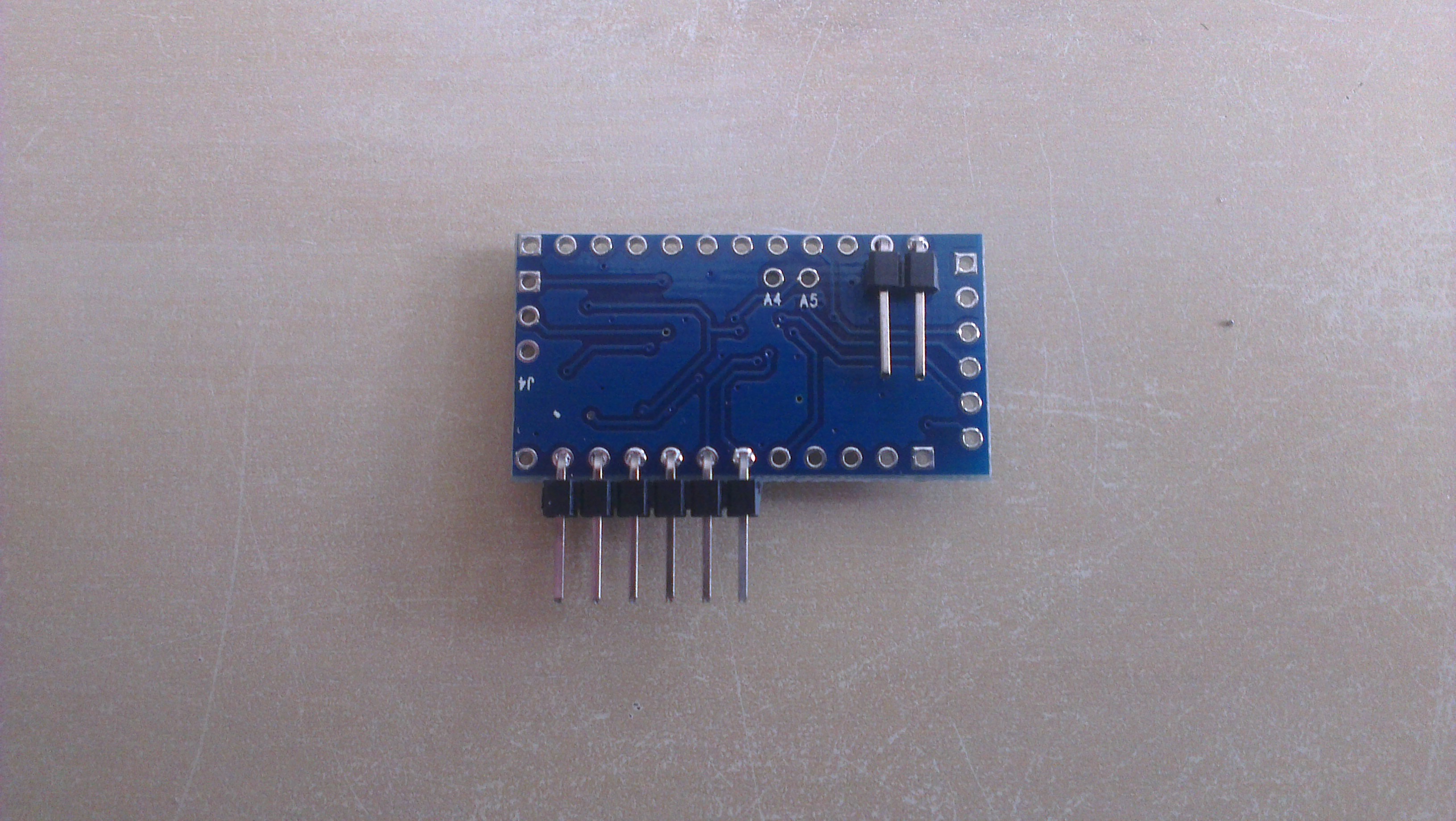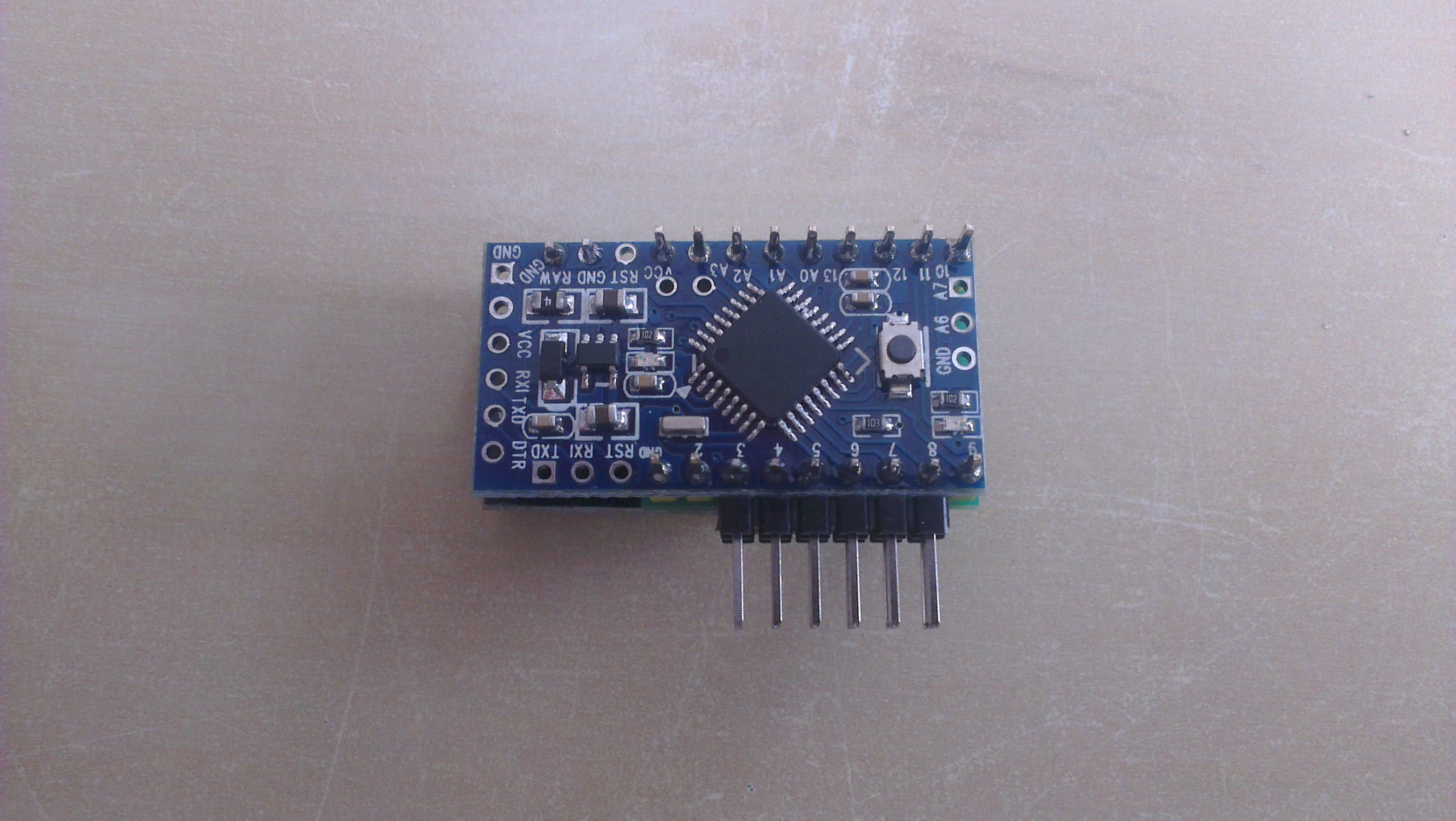 Solder 1x2 and 1x6 angular goldpin headers to Arduino Pro Mini (RAW, GND and 3...8 pins).