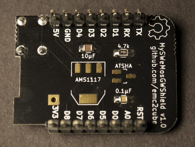For security reason you can add a CryptAuthEE SHA256 chip. This will allow you to sign messages and will secure communications between the gateway and other nodes (this is not encryption, just signing). If you decide to add the ATSHA204 chip you will need to add a 0.1µF SMD 0805 decoupling capacitor and 4.7kΩ SMD 0805 pull-up resistor. Signing can also be done at the software level, without the chip if you decide to add this function later. Currently ESP8266 MySensors gateway do not seem to support hardware encryption but it may work in a later release or if used as a node or repeater. For complete reference see the detailled MySensors Security & Signing guide