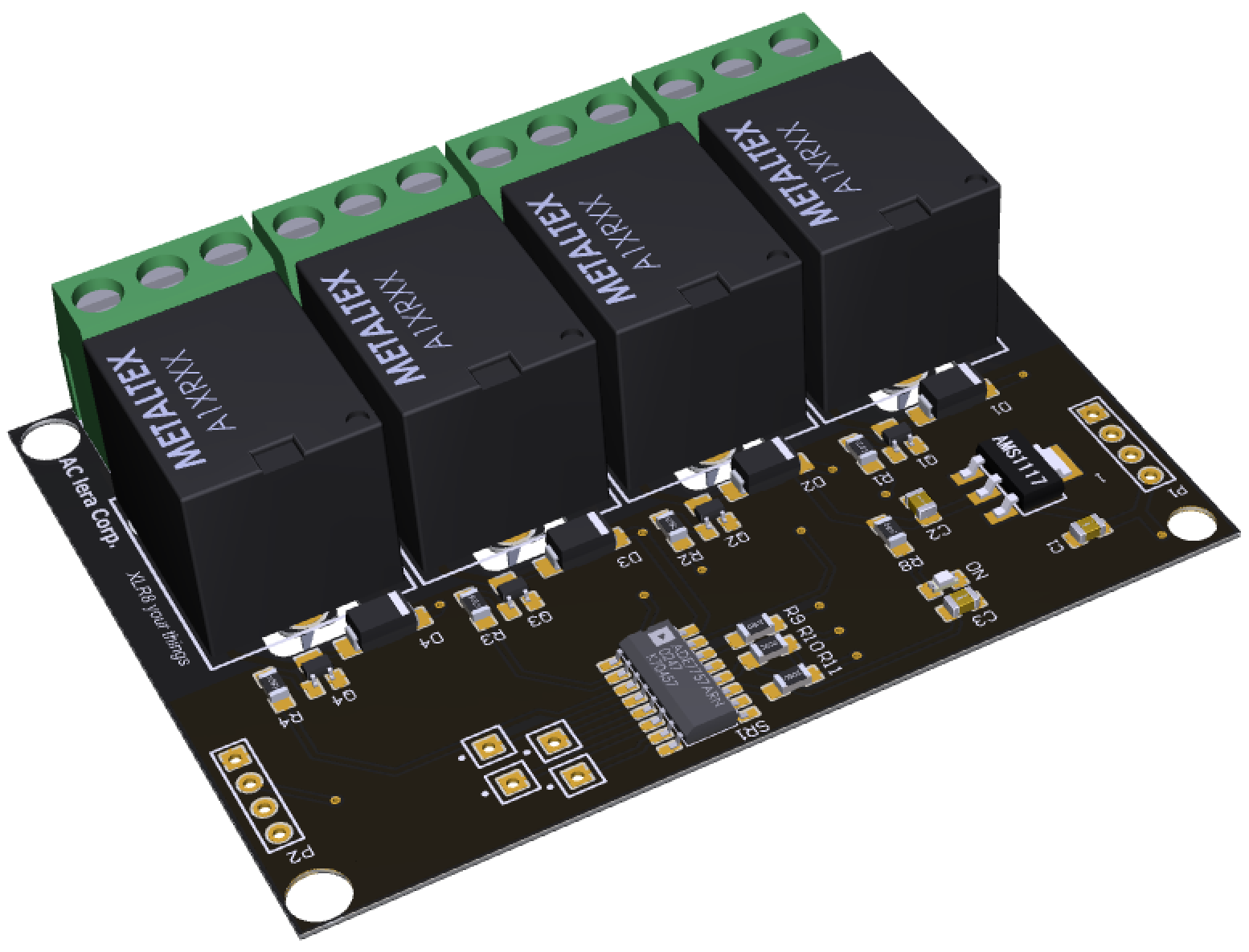 This is the relay board of my Home-Automtion, it is called RS-12, to control it we are using only 2 wires from the central (MA-02) and a 8-bit shift register, so we can put this boards in series in order to control up to 40 relays (each one has 4 relays so we can connect 10 RS-12 in series) using only 2 wires from the central.