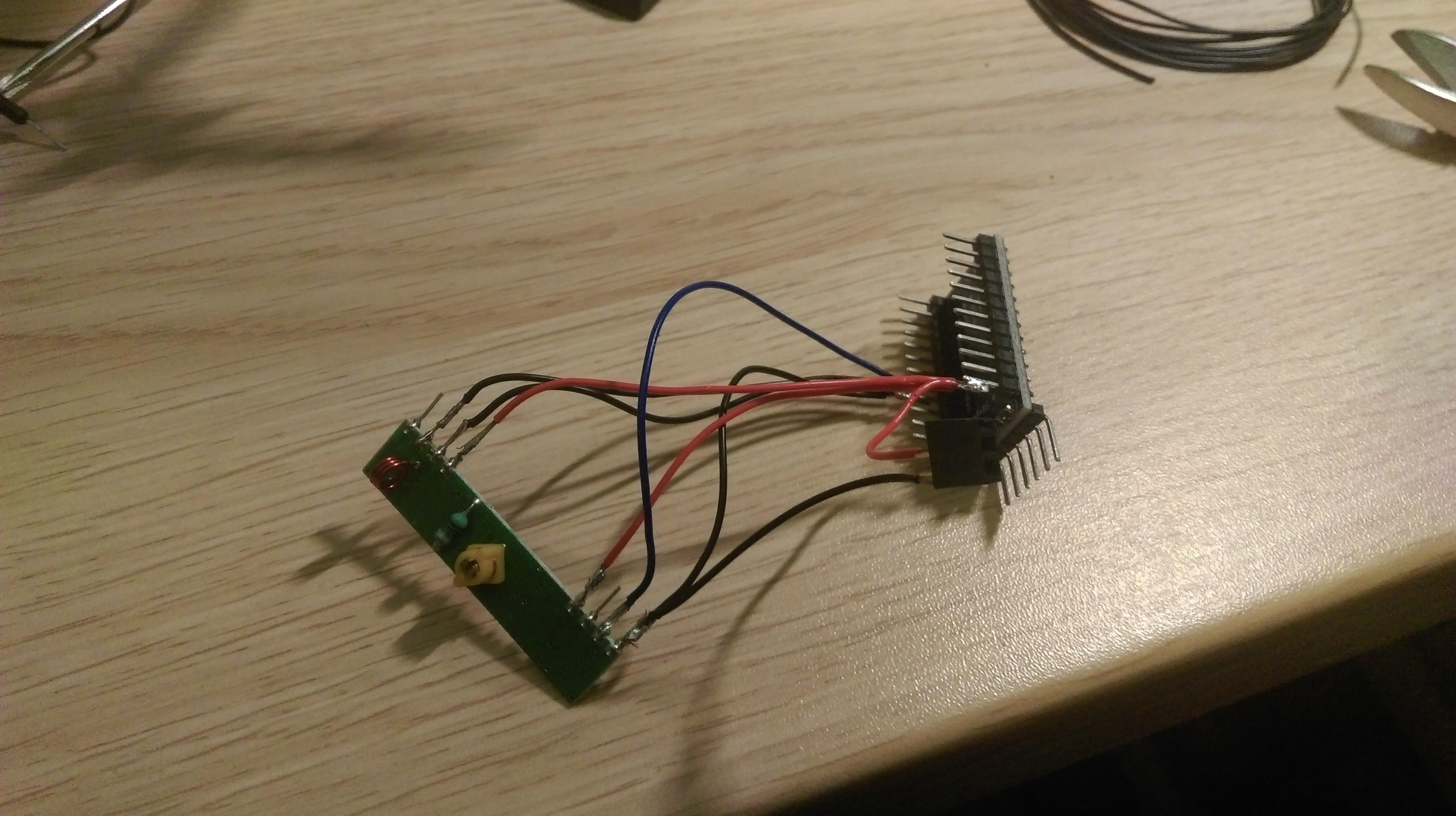 To interface with the 433Mhz devices I added a cheap receiver (and plan to add an equally cheap sender too). The receiver is connected to Gnd and 5V (3.3V isn't enough for the receiver I used). It has a pin to add an external antenna but reception was good enough for (need this in only 2 rooms) with a good power supply. There are also (newer?) version out there that have only 4 pins and no antenna pin. The data output pin is connected to interrupt 1 (pin 2) on the pro mini. The pro mini is connected to 5V through the raw pin, the NRF to the 3.3V regulated part of the pro mini. A sender will be added later.