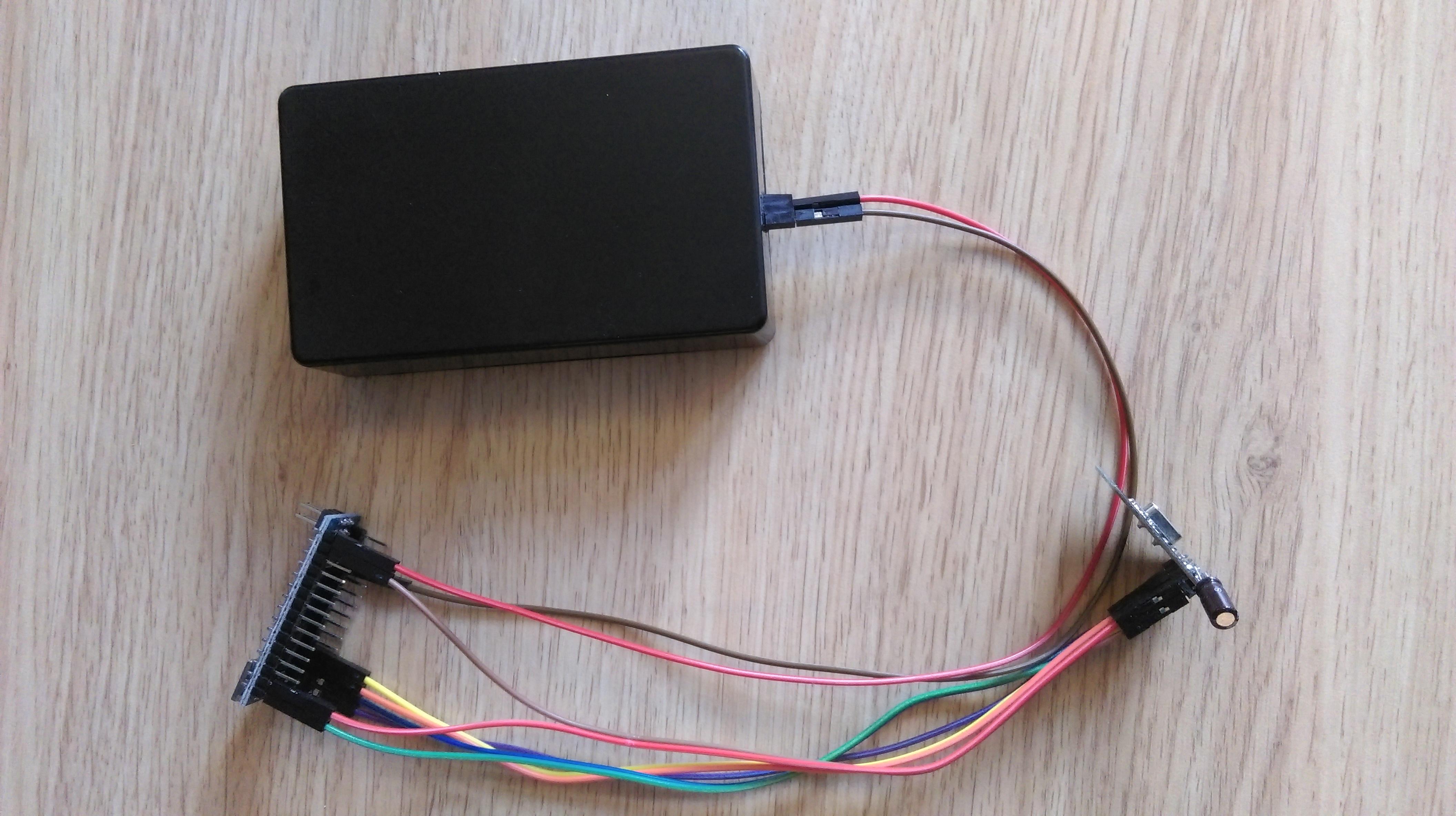 I stuffed everything into a cheap case I bought from aliexpress or ebay (can't remember). As I didn't have any connectors around (can someone recommend some cheap ones?) I soldered some female headers to the end of the power connections that stick out of the box. These are connected to my serial mysensor gateway via male-to-female connectors. Powering both devices via USB from the raspberry pi seems to work but isn't ideal (it worked more reliably I think on my bench power supply). I plan to add a separate power supply later.