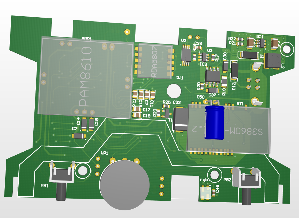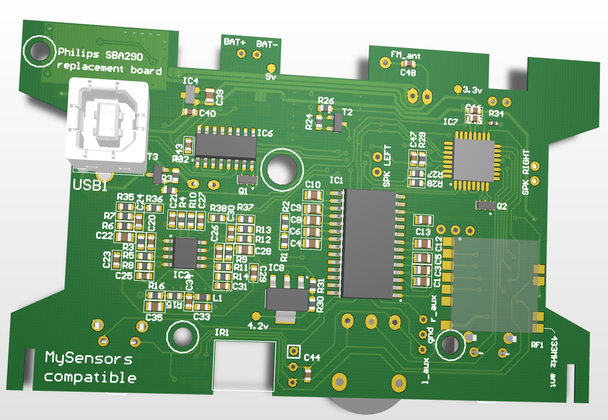 After I tried to route the project I found some things. At first I found a logic error. S3860M-S works under 3.6V in a very unstable way. It's very strange because the chip requires only 1.8v... may be it's eprom or other surprises on the module board :( So it is nececcary to use 4-4.2V power supply. Not a very trivial task because battery level is lower, main power supply level is higher. Moreover I didn't have enough space to correctly layout one more switching converter. So I just put LDO, it's not effective but it's not a crime (~26ma). Second... I routed the board carefully so I have enough space near atmega for RFM69. HELLO MySensors network! I am not sure which tasks I plan to solve using mysensors environment but I fitted RFM radio onboard and changed the remaining non controled power lines to be able to down the device to sleep mode with relatively low power consumption ;)