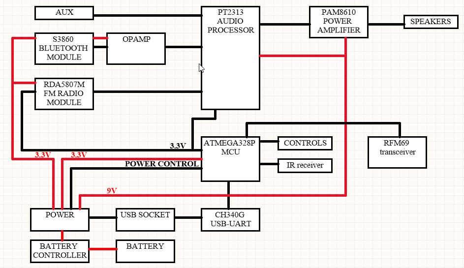 I had some PAM8610 amplifier boards so I decided to use them. It requires 9V power supply (PT2313 requires too) so we need a step-up. No problem, sx1308 is a reliable and cheap solution with high operated frequency so we do not need a very large inductor (not suitable for hi-fi, but it is not hi-fi :) ).