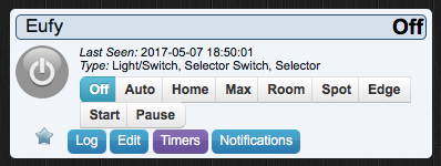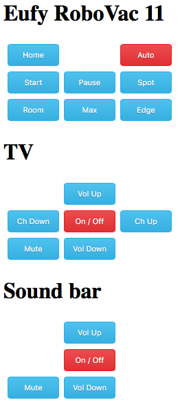 Example code implementing custom web server and MySensors support. You will (very probably) need to modify this code with your own IR codes and definitions. This program was created to allow me to control my Eufy RoboVac 11 robotic vacuum cleaner which unfortunately by default lack of any advanced scheduling options. By default, this vacuum cleaner will start its "auto" mode every day at the same hour, but can now be scheduled to operate only certain days, at different times, or even using different modes.