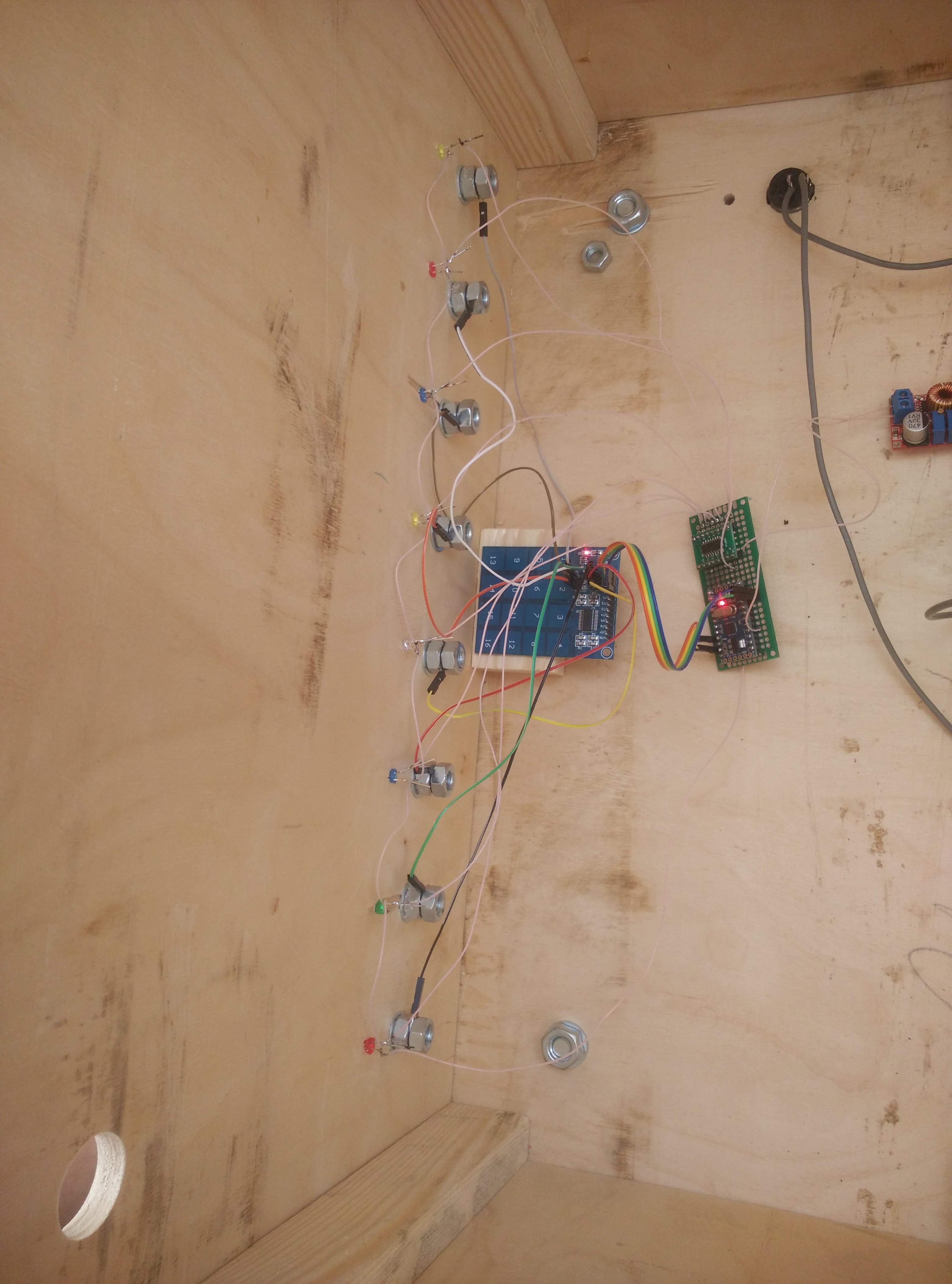 So I connected 8 touch buttons and 8 color leds via shift register (74HC595)