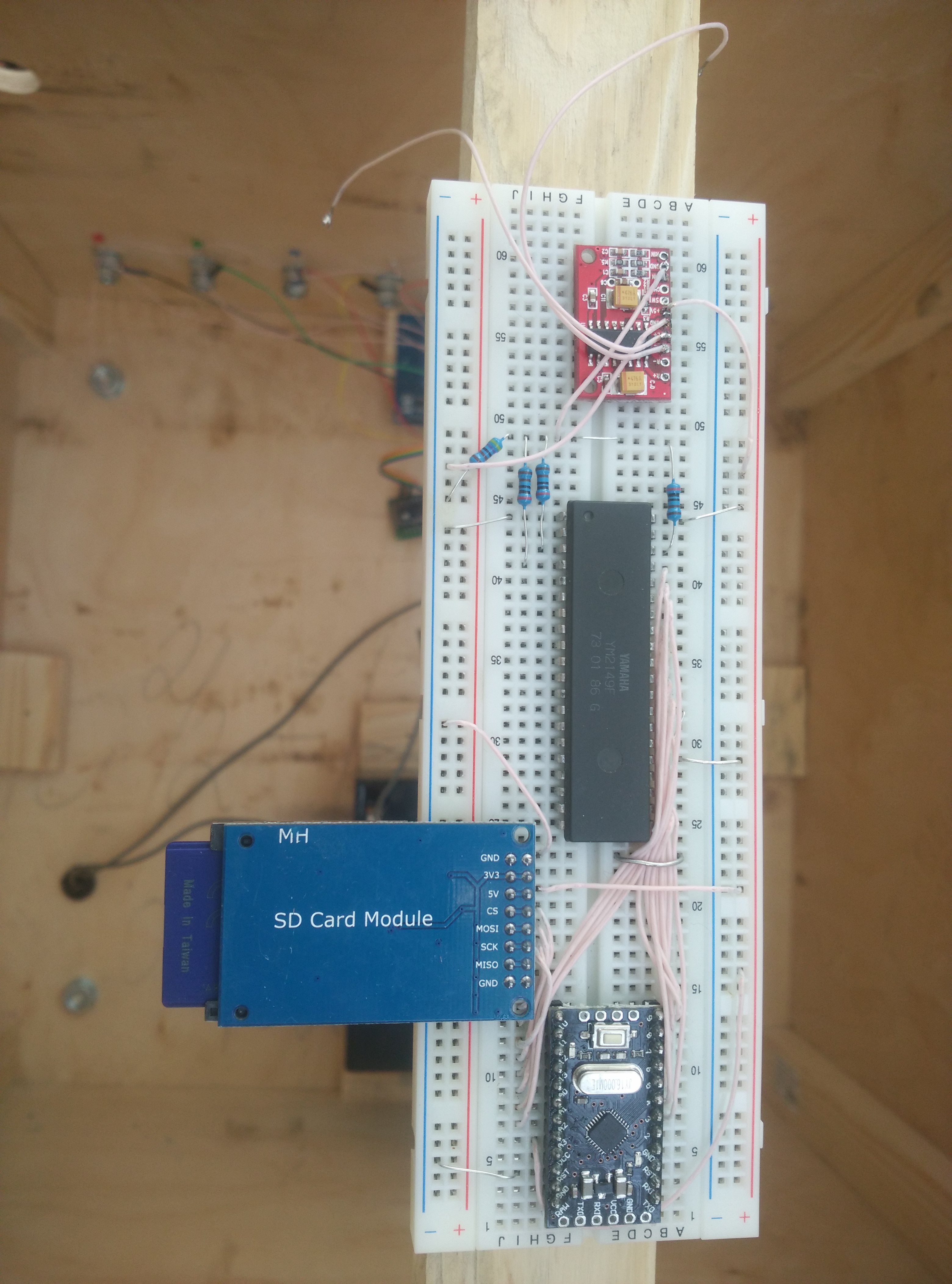 I connected it to the arduino pro mini with a little trick with timers to eliminate additional crystal oscillator. I also used inexpensive audio amplifier PAM8403 (unfortunatelly I have some troubles with it but I hope I will solved all of them). Music files are read from ordinary arduino SD card reader.