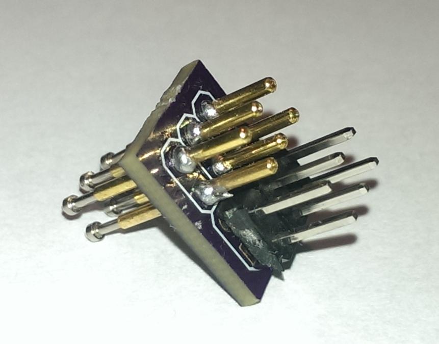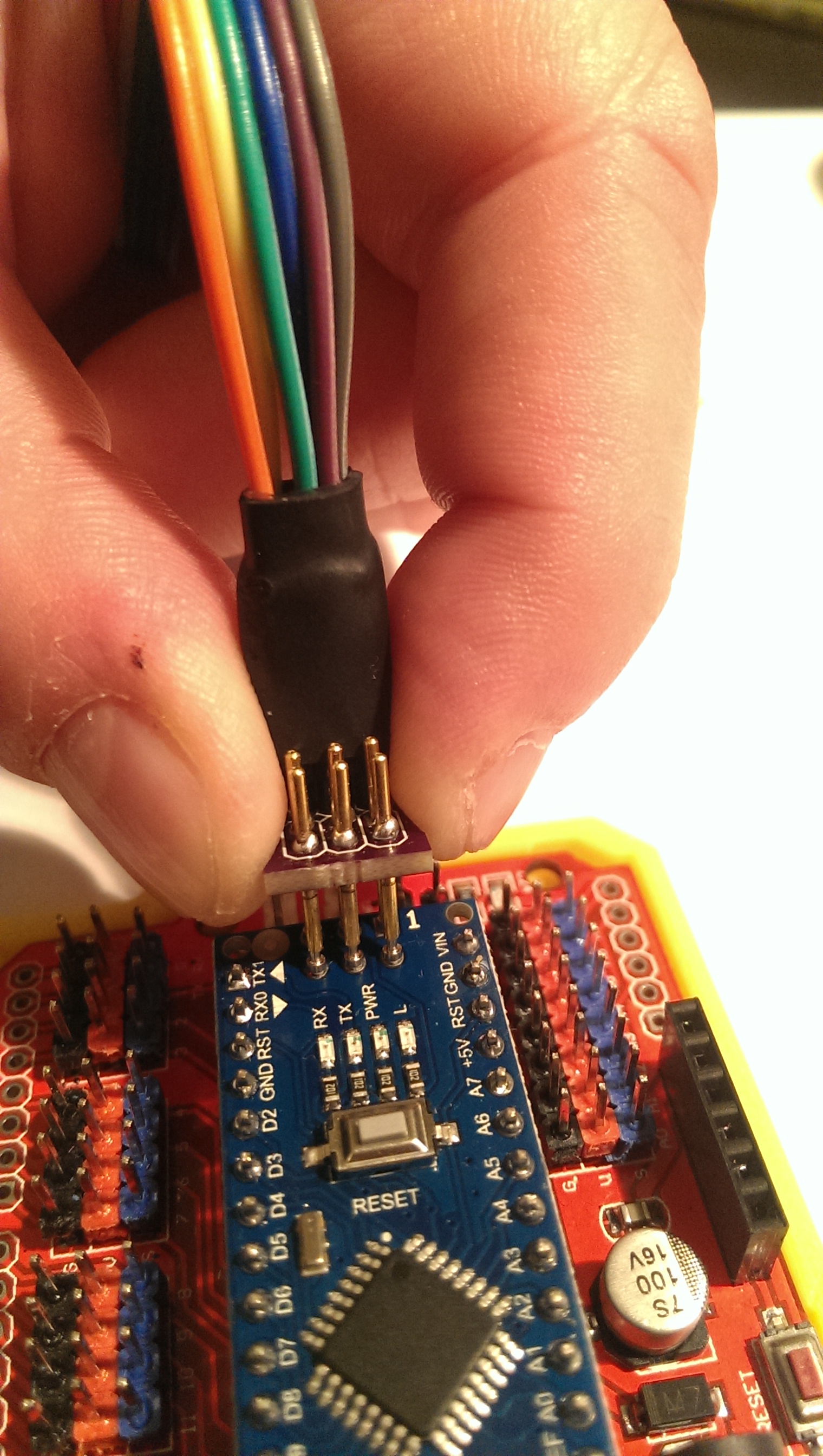 So, I usually don't want to solder male pin headers to the ICSP pin holes on the PCB, as I know I will never ever use them again after the initial bootloader upload. Unfrotunately, using the male header pins of the USB interface with the unsoldered pin holes in the PCB is a messy story and no matther how you tilt the connector press the pins agains the unsoldered holes, it is almost impossible to keep a stead connection of all six pins with the PCB.