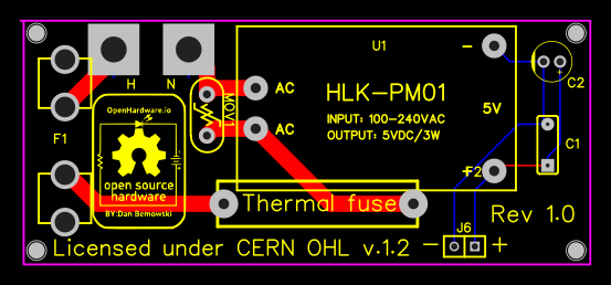 This power supply board is part of a multi board build to create a MySensors based scene controller/light switch that fits inside a standard US single gang wall switch/outlet box. The power supply is designed around the HI-LINK HLK-PM01 switching power supply module. It is designed to output 5 volts to power the controller board that mates up with a micro controller board through the use of a 3D printed board support.