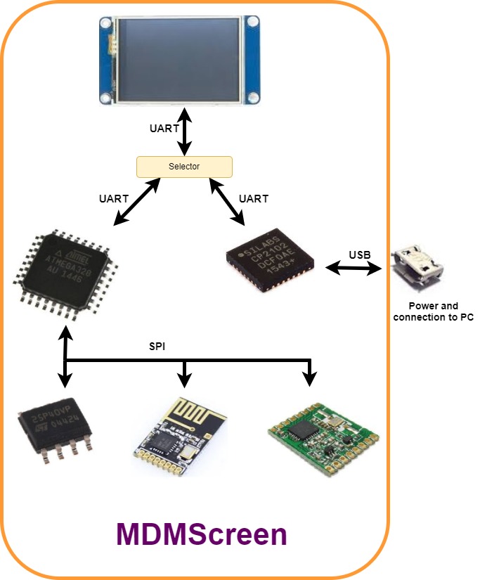 MDMScreen must performs two main functions - displays information and controls other nodes. I am going to use this in each room in my house. The main module of the device is very popular 2.4" TFT LCD Touch Display Nextion NX3224T024G. You can read about this module there. Also there are many examples how to create your own interface.