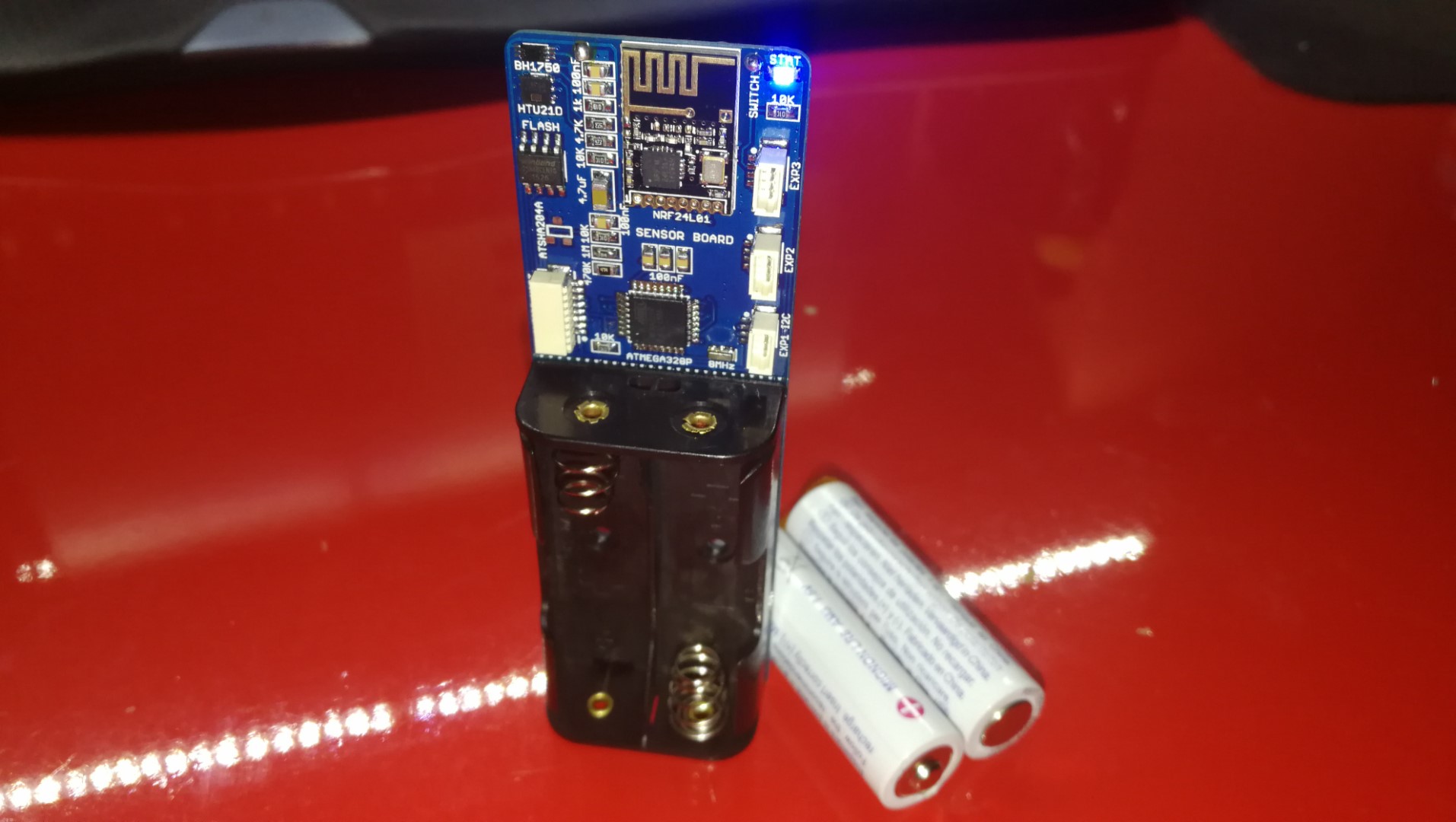 It is a sensor powered by 2 AA batteries or 1 CR2032 battery, it integrates a temperature, humidity and light sensor. It also has two pins for a magnetic push-button in crystal housing and 3 expansion connectors.