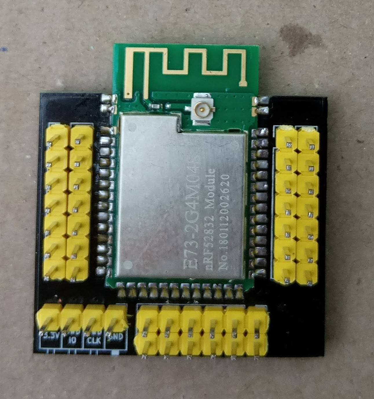 Small breakout board with SWD headers for the EByte NRF52832 Module. All pins are accessible. Dimensions: 34.95mm x 31.14mm