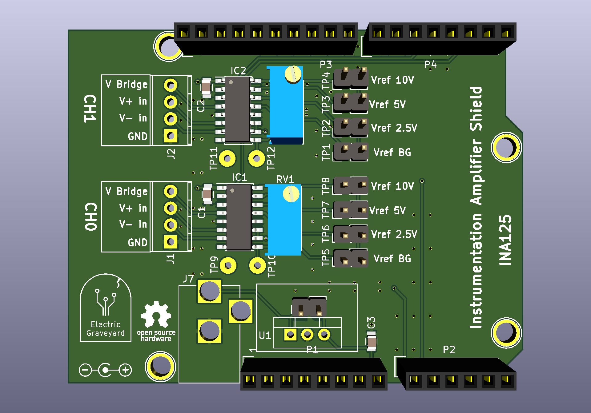This is a 2-channel Instrumentation Amplifier shield based on the Burr-Brown INA125: http://www.ti.com/product/INA125