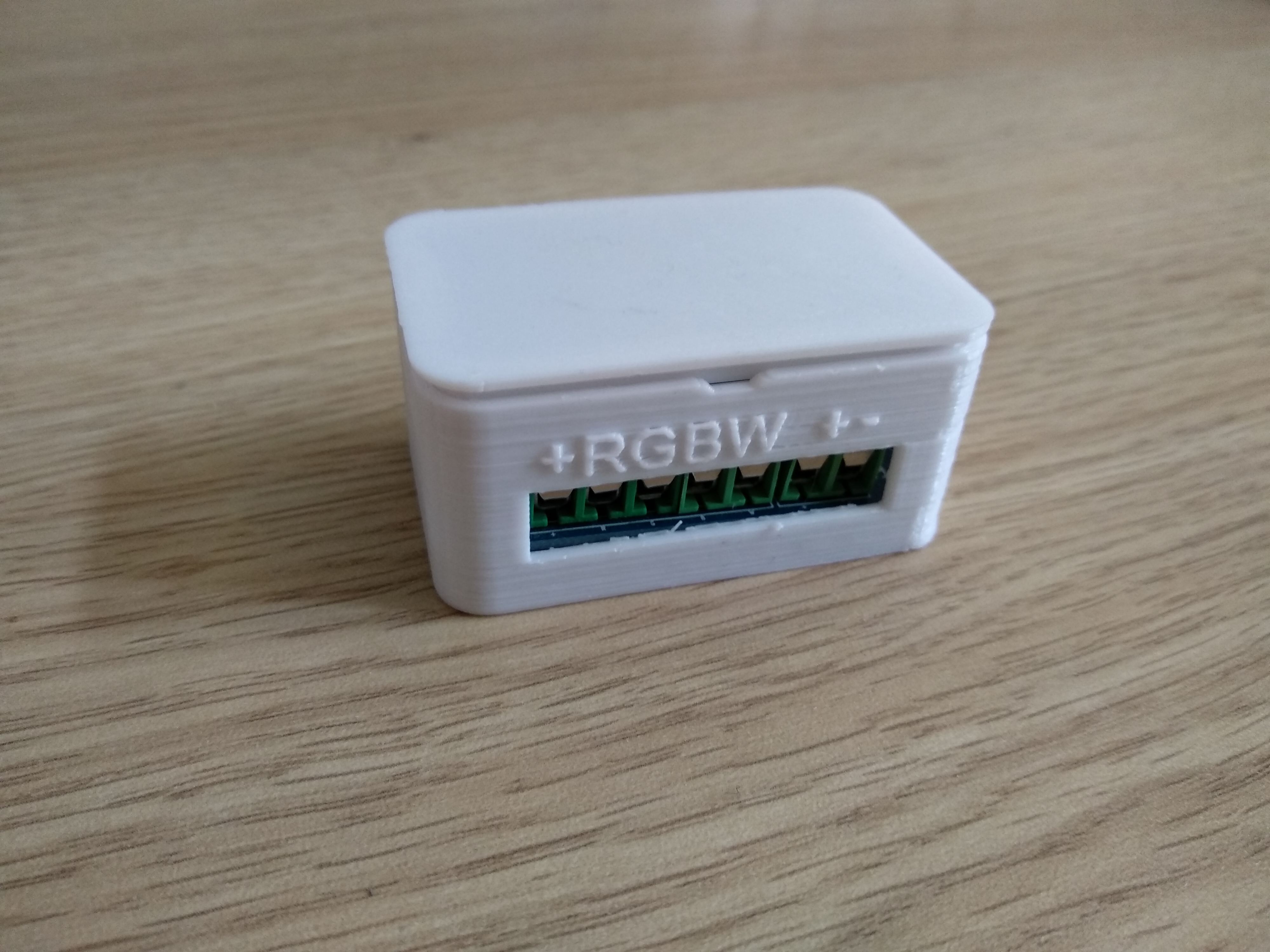 I recently got a 3d printern and so I started to design and print a custom enclosure for my RGBW controller(s). It features labels on the front, a mounting point for cable management on the side and standoffs with screw holes for the pcb on the inside. The front has a matching cutout to connect all cables otherwise its closed. The lid just clips in and can be (re)opened at any time.