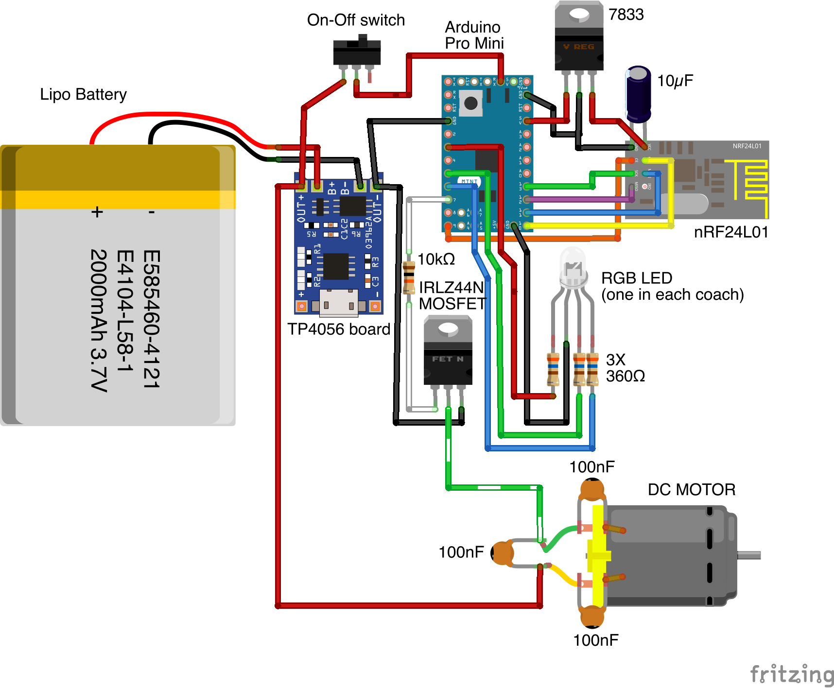 Setup is quite simple. it is basically a pro mini running a RGBW dimmer sketch, where the (W)hite channel drives the DC motor via a MOSFET, while the other RGB channels drive some RGB leds in the two coaches.