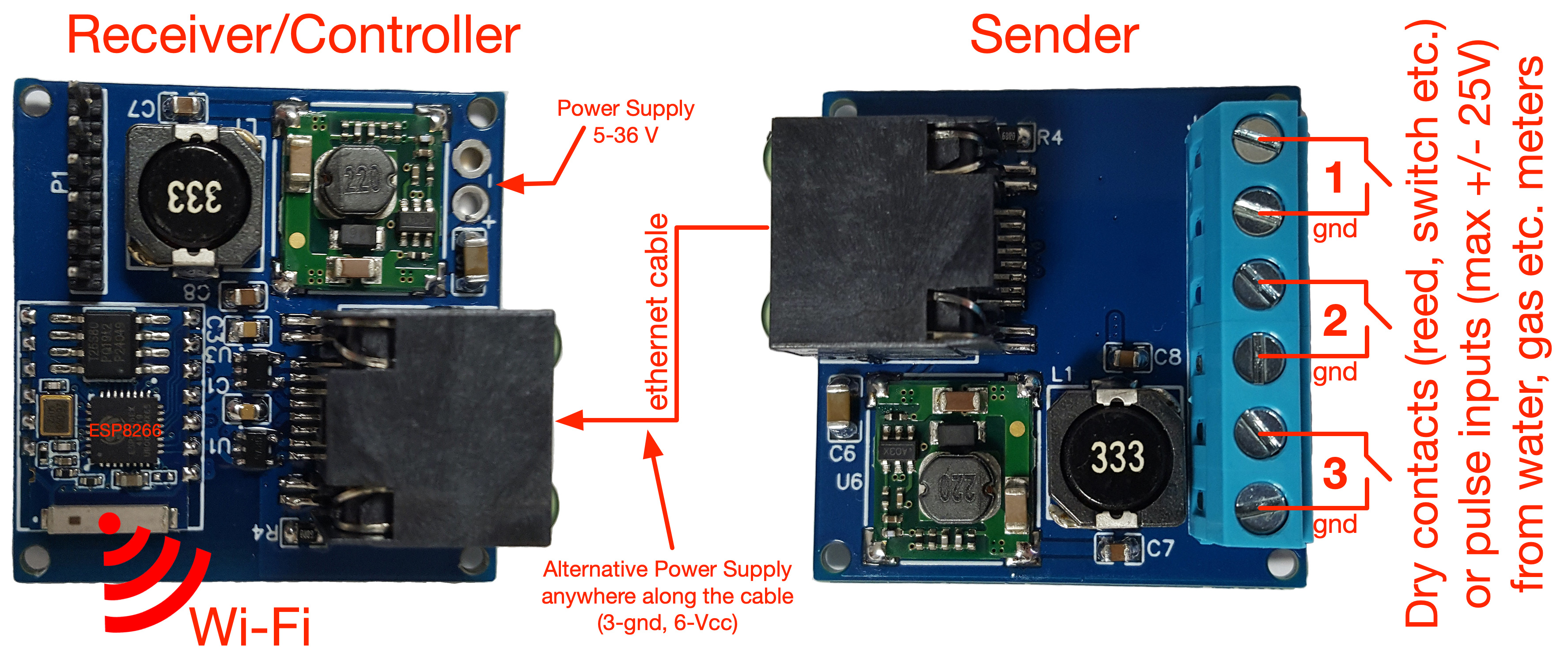 It is composed of two very small (approx 4x4.5cm) junction boxes: the sender and the receiver/controller which integrates an ESP8266 connected to the WiFi for IoT applications.