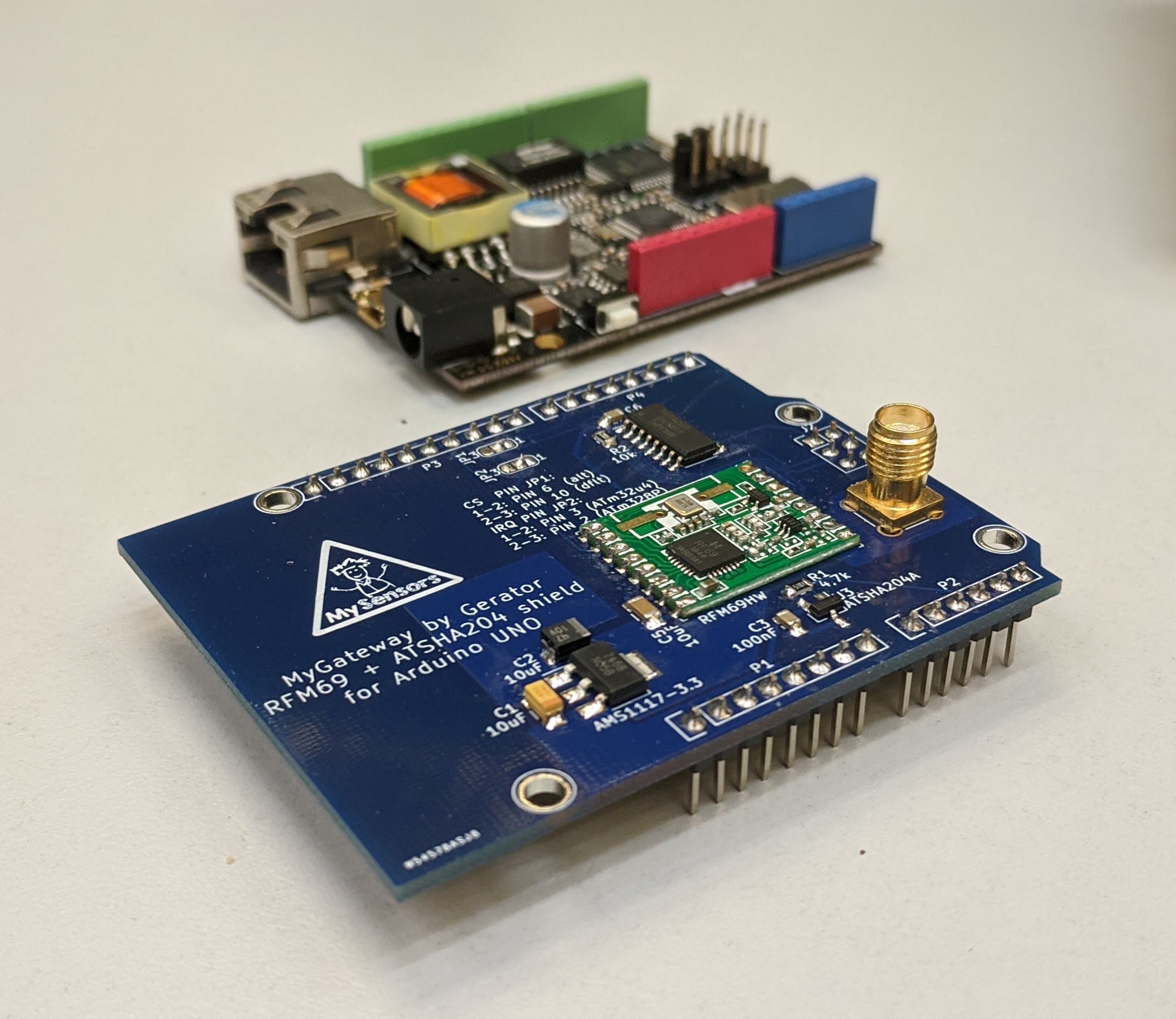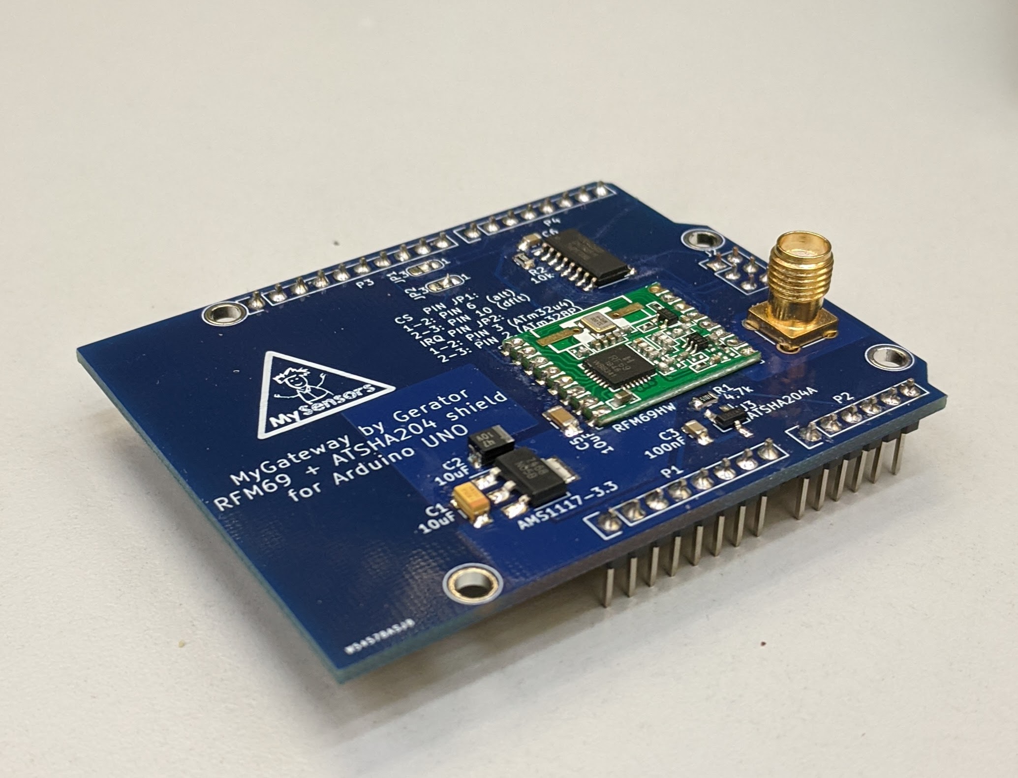 This is another shield to build a MySensors gateway with Arduino UNO form factor. It includes RFM69 radio module and ATSHA204A crypto signing chip.