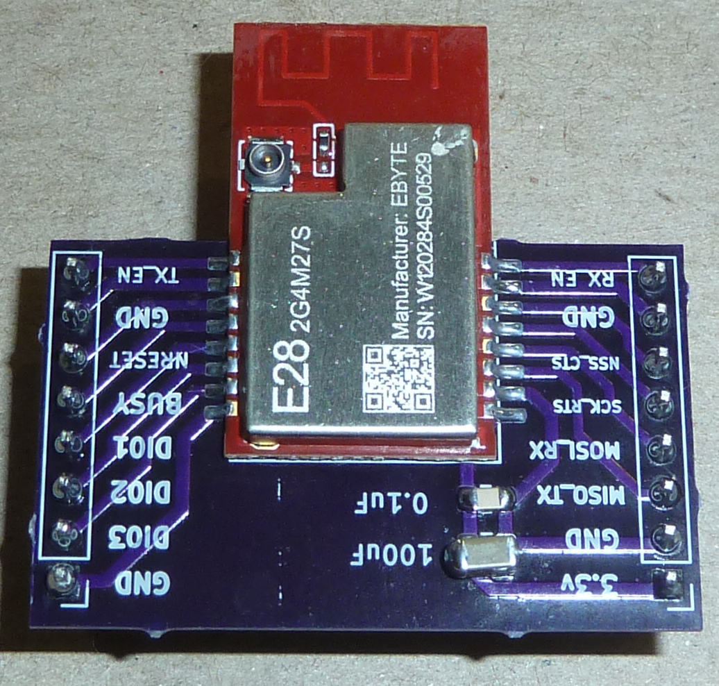 Breakout board for EBYTE's E28-2G4M27S 2.4GHz LoRa module.